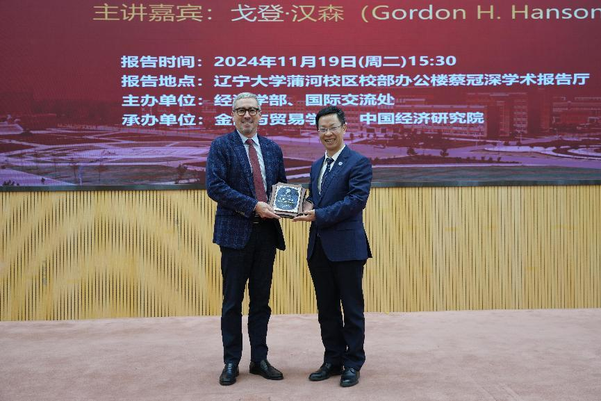 11月19日下午,bat365中文官方网站宋则行海外名家大讲堂(第十七讲)在蒲河校区校部办公楼二楼蔡冠深学术报告厅举行。哈佛大学肯尼迪学院戈登汉森教授应邀作题为《美国地区经济困境的原因与后果》的学术报告。第十四届全国人大代表,辽宁省第十四届人大常委会委员,bat365中文官方网站党委副书记、校长余淼杰出席报告会并致辞,副校长李宇鹏、仇焕广出席报告会,国际交流处处长谢名一、经济学部副主任王伟光、中国经济研究院副院长兼金融与贸易学院副院长马湘君、国际交流处副处长尹如玉、经济学部办公室主任孔晓参加报告会。报告会由仇焕广主持。