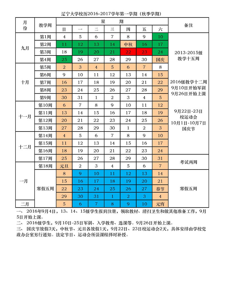 2016-2017学年第一学期(秋季学期)校历