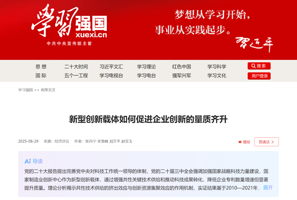 近日,“学习强国”平台转载了经济学院张丹宁教授发表在《经济评论》2025年第4期的文章《新型创新载体如何促进企业创新的量质齐升》,现将原文转载如下: