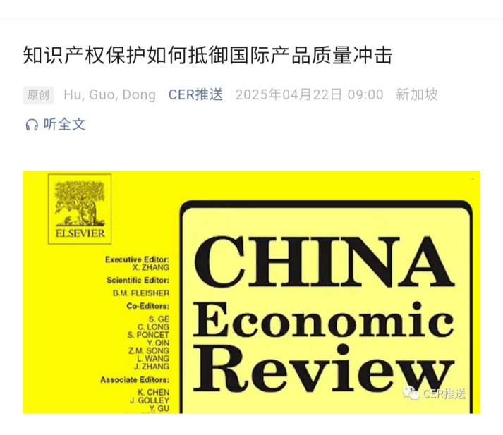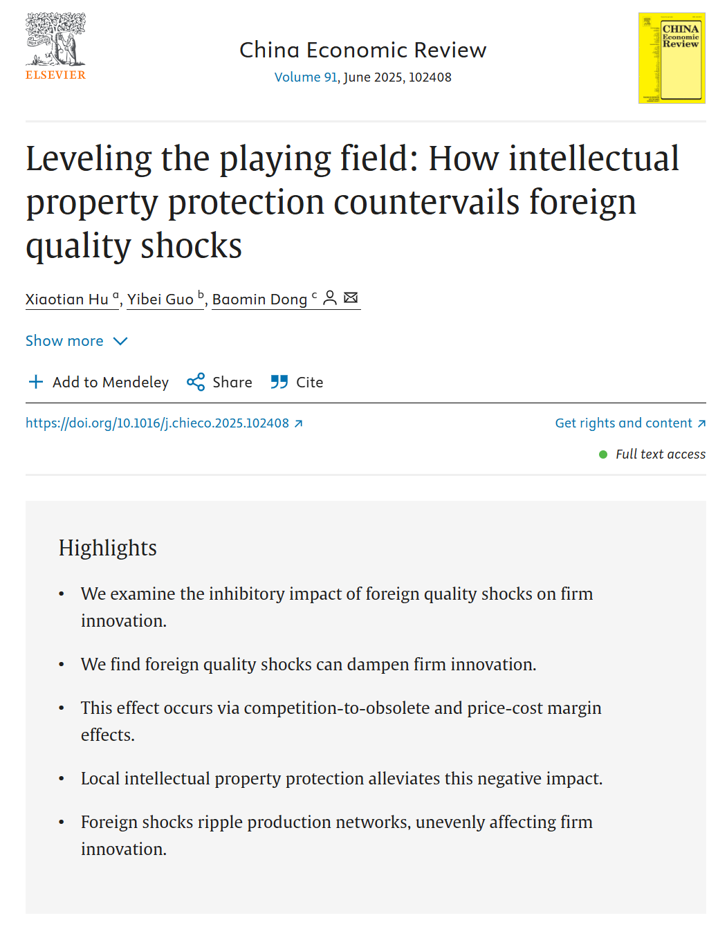 近日,bat365中文官方网站经济学部副主任董保民教授与北京工商大学经济学院讲师胡晓天、河南大学商学院讲师郭益蓓合作撰写的学术论文“Leveling the playing field: How intellectual property protection countervails foreign quality shocks”在China Economic Review发表并被期刊官方公众号推送。