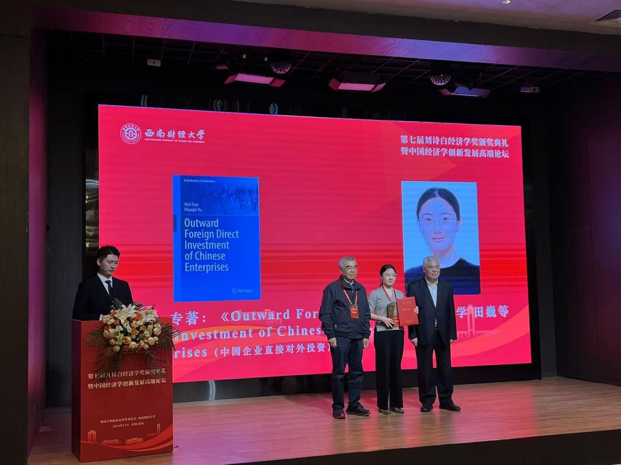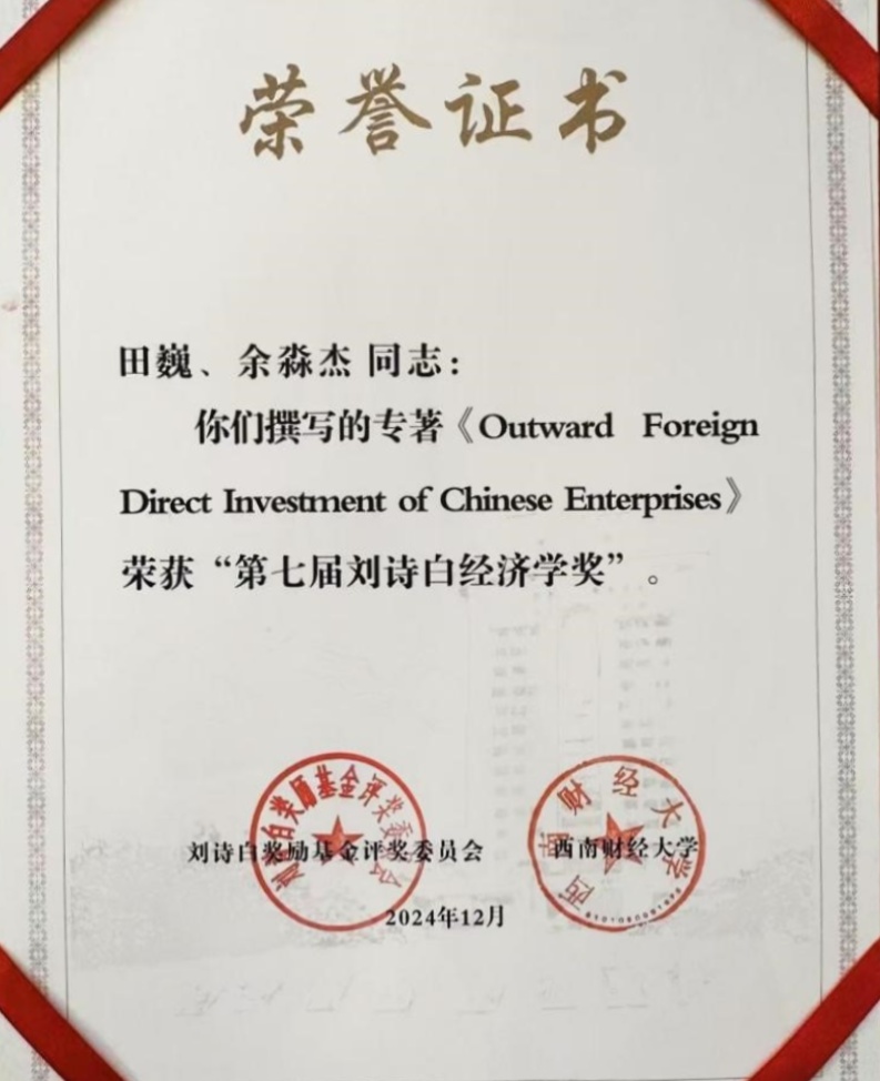 2024年12月22日,第七届刘诗白经济学奖颁奖典礼暨中国经济学创新发展高端论坛在京举行。经资格审核、专家通讯评审和会议评审以及评奖委员会审定,本届共评选出10项获奖成果,北京大学长聘副教授田巍与bat365中文官方网站校长余淼杰教授合作专著《Outward Foreign Direct Investment of Chinese Enterprises(中国企业对外直接投资)》上榜。这是余淼杰教授继2014年其著作《加工贸易与企业生产率》入选第二届刘诗白经济学奖后再度喜获此奖。