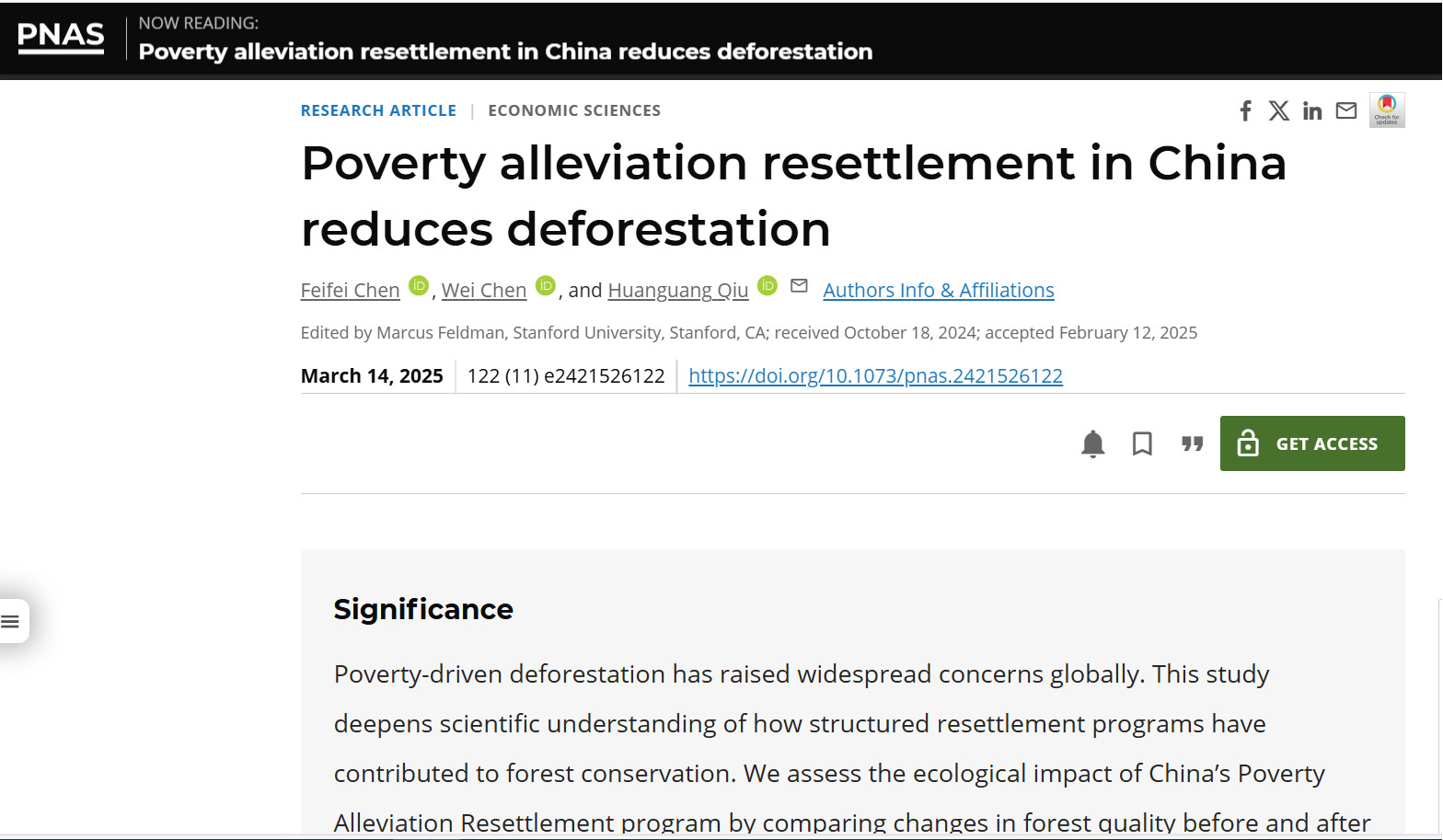 近日,bat365中文官方网站仇焕广教授与中国矿业大学(北京)陈菲菲博士、中国人民大学陈威副教授的合作论文“Poverty Alleviation Resettlement in China Reduces Deforestation”在国际顶级期刊《美国国家科学院院刊》(简称PNAS)上正式发表,仇焕广教授为本文通讯作者和共同第一作者。